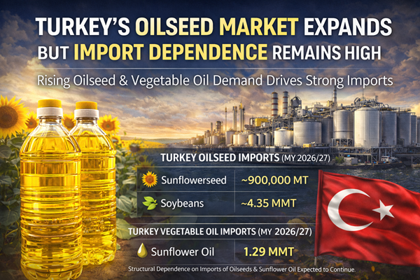 Turkey’s oilseed sector is expected to expand moderately in the coming marketing year, supported by improved weather conditions and rising feed demand from the livestock and poultry sectors. However, despite the projected increase in domestic production, the country will remain heavily dependent on imports of oilseeds and vegetable oils to satisfy domestic consumption and export demand.